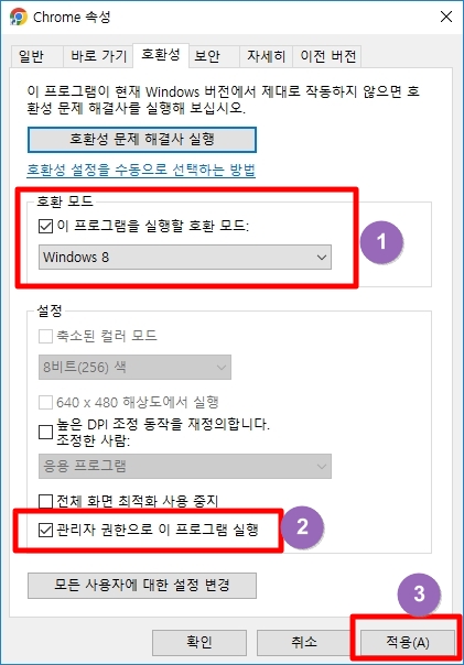 2) "관리자권한으로 이프로그램 실행" 에도 체크 한다음 적용버튼을 눌러주세요.