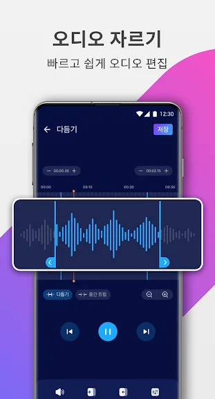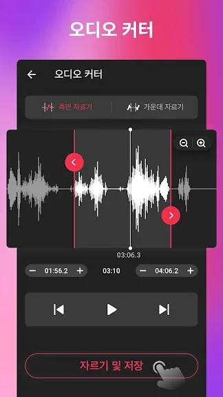 음악 커터 & 벨소리 만들기를 사용하면 웨이브 폼 줌 또는 한 번의 탭으로 오디오 길이를 빠르게 선택하여 시작 시간 또는 종료 시간을 수동으로 설정할 수 있습니다. 또한 오디오 편집기에서 음악 클립을 재편집할 수 있습니다.