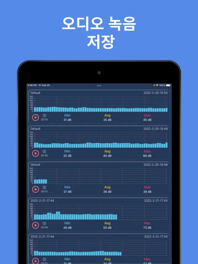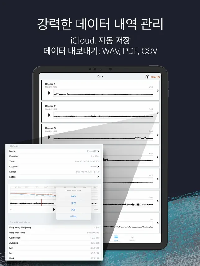 녹음 데이터를 저장하고 고화질 PNG, CSV, PDF 등의 형식으로 내보낼 수 있어 기록을 체계적으로 관리할 수 있습니다. InstaDecibel 기능으로 측정 결과를 사진과 함께 캡처하여 손쉽게 공유할 수도 있습니다.