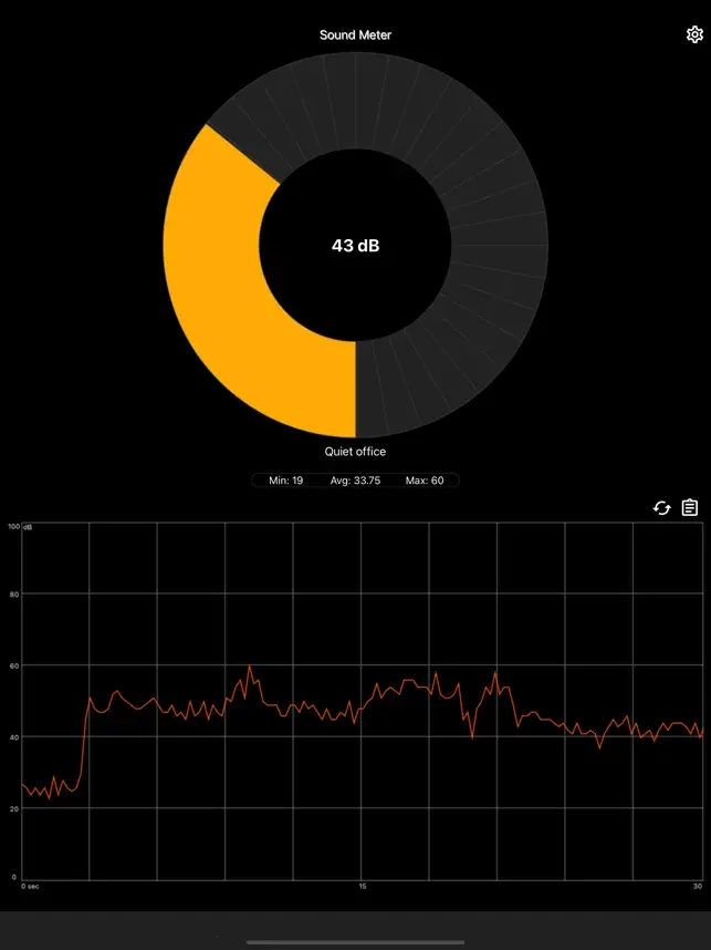 Simple Sound Meter는 주변 환경의 소음 레벨을 데시벨(dB)로 측정하여 즉각적으로 결과를 제공합니다. 사무실의 대화 소리부터 굴삭기 소음까지 다양한 소음을 간단히 파악할 수 있습니다.