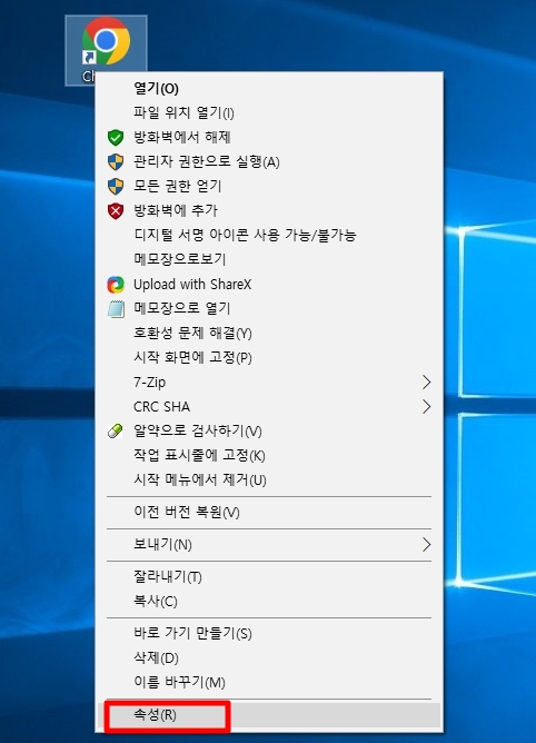 바탕화면의 크롬바로가기 링크에 마우스 우클릭후 속성에 들어갑니다.