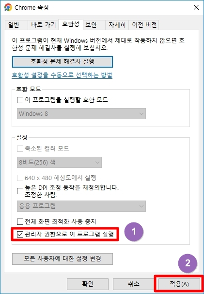 2) "관리자권한으로 이프로그램 실행" 에도 체크 한다음 적용버튼을 눌러주세요.