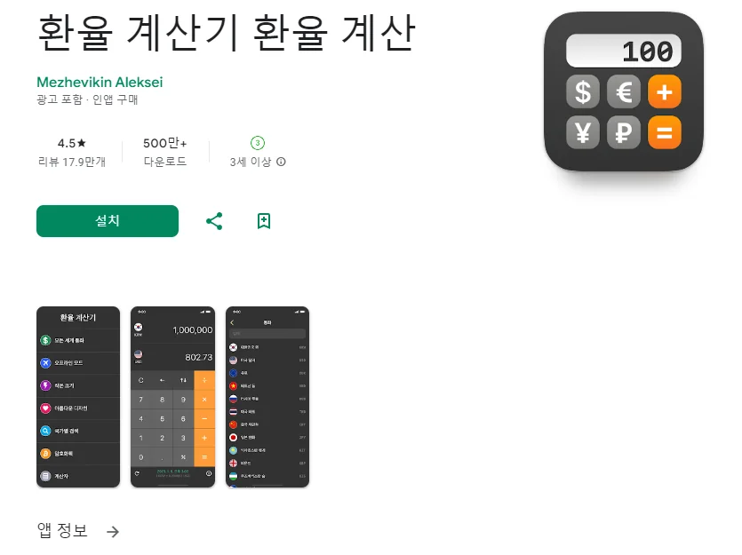 이 어플은 구글플레이스토어에서 "환율 계산기"로 검색했을때 3번째로 나오는 어플입니다. 아래는 환율 계산기 환율 계산 어플에 대한 자세한 설명이니 참고하세요.
