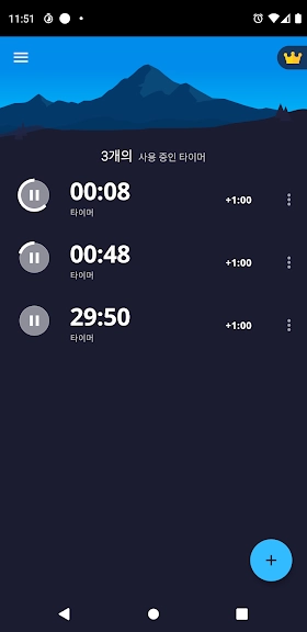 자주 쓰는 타이머 시간을 기본 타이머로 저장할 수 있으며, 동시에 여러 타이머를 실행할 수 있습니다.