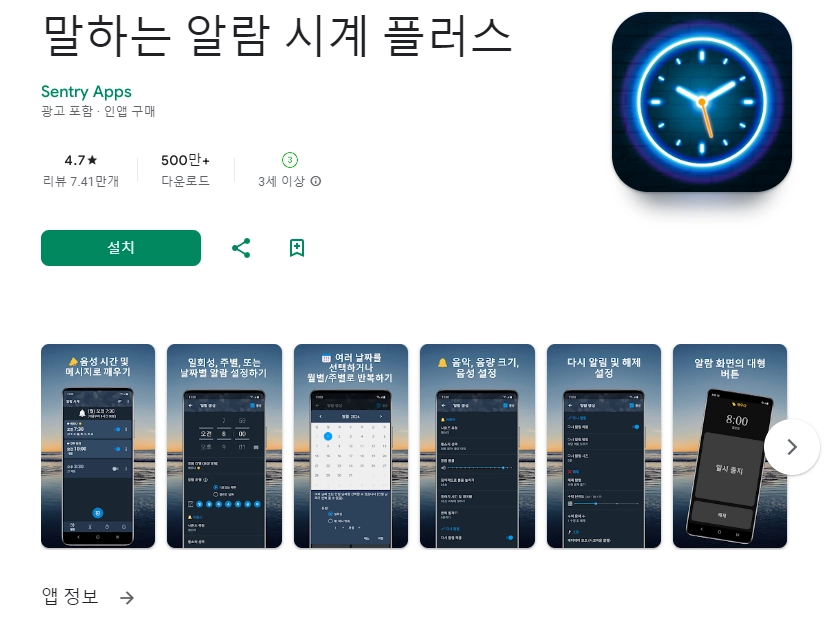 아래는 말하는 알람 시계 플러스 어플에 대한 스크린샷 정보입니다.
