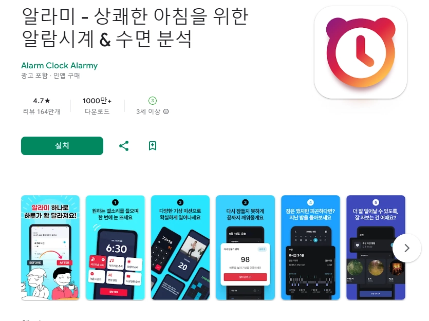 이 어플은 구글플레이스토어에서 "알람시계"로 검색했을때 4번째로 나오는 어플입니다. 아래는 알라미 - 상쾌한 아침을 위한 알람시계 & 수면 분석 어플에 대한 자세한 설명이니 참고하세요.