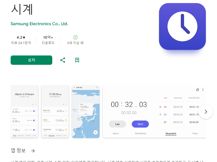 알람시계: 알람, 스톱워치, 타이머, 시계, 알림 어플에 대한 스크린샷 정보가 필요하시다면 아래 이미지를 참고하시기 바랍니다.