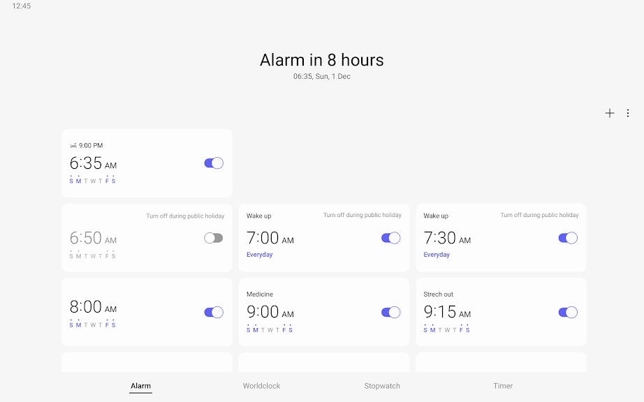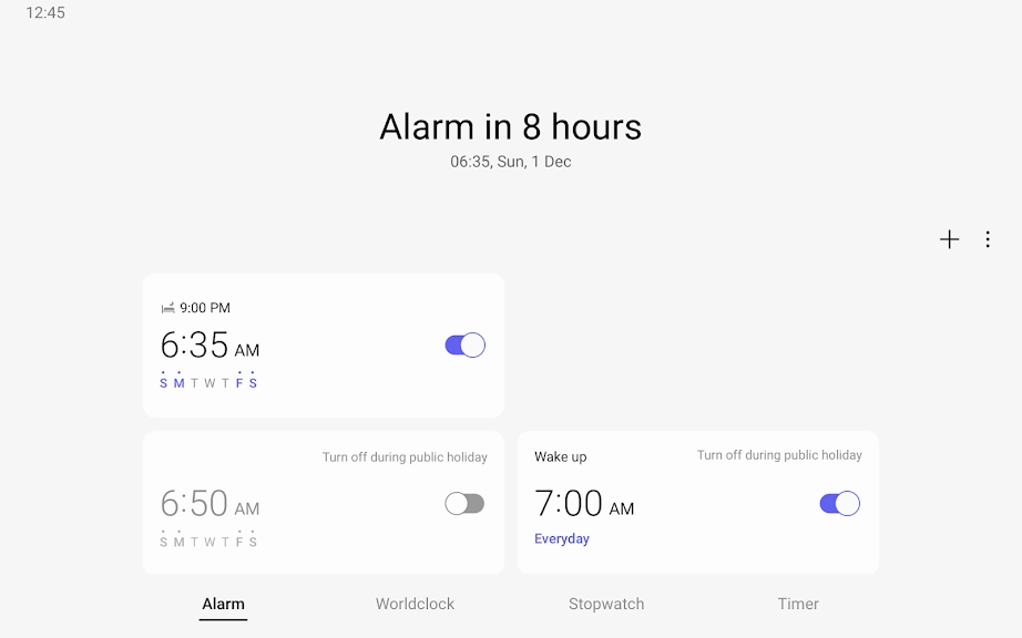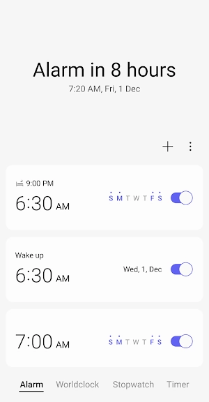 알람에 날짜를 지정할 수 있으며, 반복 알람은 하루 건너뛰고 다시 켜기가 가능합니다. 다시 울림 기능으로 알람을 여러 개 맞춘 효과를 낼 수 있습니다.