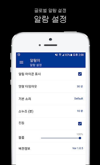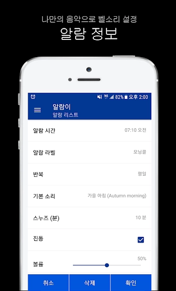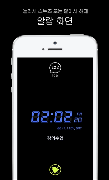 - 스누즈, 타임아웃, 진동, 기본소리, 볼륨조절