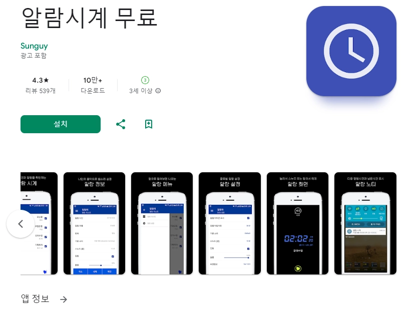 이 어플은 구글플레이스토어에서 "알람시계"로 검색했을때 1번째로 나오는 어플입니다. 아래는 알람시계 무료 어플에 대한 자세한 설명이니 참고하세요.
