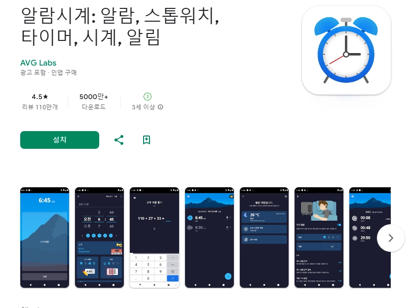 이 어플은 구글플레이스토어에서 "알람시계"로 검색했을때 3번째로 나오는 어플입니다. 아래는 알람시계: 알람, 스톱워치, 타이머, 시계, 알림 어플에 대한 자세한 설명이니 참고하세요.