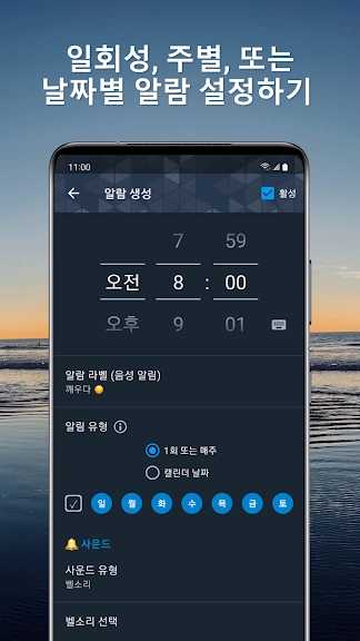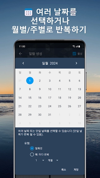 ★ 알람은 1회, 매주 반복 또는 미래의 특정 날짜에 지정할 수 있습니다(2024년 1월 1일도요? 물론이죠, 왜 안되겠어요!)