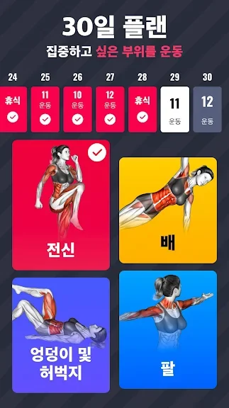 ▶ 까먹고 있을때면 알림도 떠서 좋고 초반부터 빡쎈게 아니라 점점 강도를 올리는 형식이라 적응하기 쉽고 운동도 건너뛰거나 다시 할수있어서 좋은듯!부위별 운동도 따로 있어서 부위별로 다 조질수있어욤ㅎㅎ굳굳