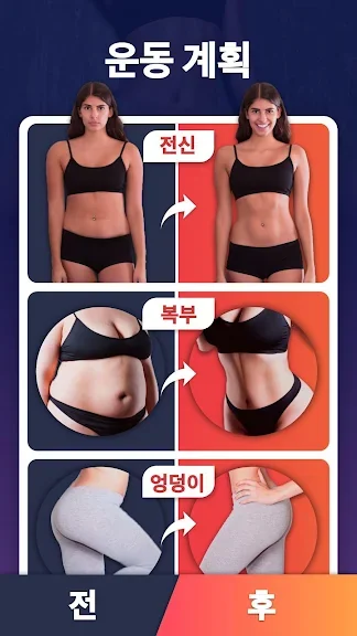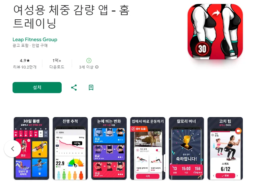 아래는 여성용 체중 감량 앱 - 홈 트레이닝 어플에 대한 스크린샷 정보입니다.