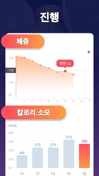 연소된 칼로리와 체중 감량 과정을 그래프로 확인할 수 있습니다. 헬스장에 갈 필요도, 장비도 필요 없어요. 그냥 체중을 이용하는 것만으로도 몸 전체를 탄력 있게 만들고 탄탄한 근육을 만들 수 있어요.