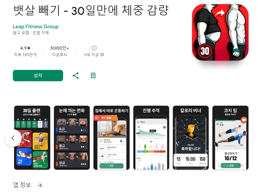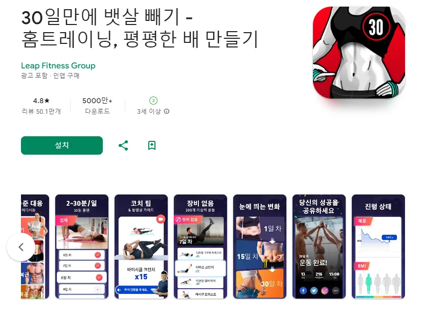 이 어플은 구글플레이스토어에서 "뱃살 빨리 빼는 방법"로 검색했을때 1번째로 나오는 어플입니다. 아래는 뱃살 빼기 - 30일만에 체중 감량 어플에 대한 자세한 설명이니 참고하세요.