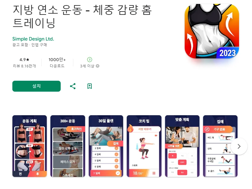 아래는 지방 연소 운동 - 체중 감량 홈 트레이닝 어플에 대한 스크린샷 정보입니다.