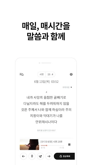 ▶ 유료로 구매하여 잠금화면 사용 중입니다! 하단에 있는 말씀 넘기기 버튼이 더 커지거나, 손가락 제스처를 우측에서 좌측으로 밀면 다음절로 갈 수 있으면 좋겟습니다. 혹은 우측을 터치함으로써 쉽게 넘어갈 수 잇다면 어떨지요? 또한 음성으로 가는 버튼도 선택적으로 할 수 있도록 옵션이 생기면 좋을 것 같습니다. 세련되고 깔끔한 어플이 마음에 들어 구매했습니다. 감사합니다 :)