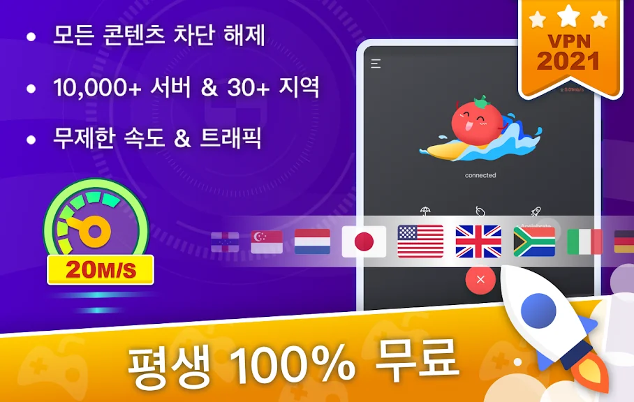 무료 VPN Tomato로 사이트, 앱, 게임의 차단을 해제할 수 있습니다. 정부 검열과 지역 제한을 우회하여 Facebook, Twitter, YouTube, Snapchat, PUBG, Free Fire, Twitch 같은 SNS 또는 그 외 어디든 차단된 웹사이트에 액세스할 수 있습니다. 어디에 있든지 국경의 제한 없이 다양한 TV와 영화, 라이브 스포츠 경기를 감상하세요.