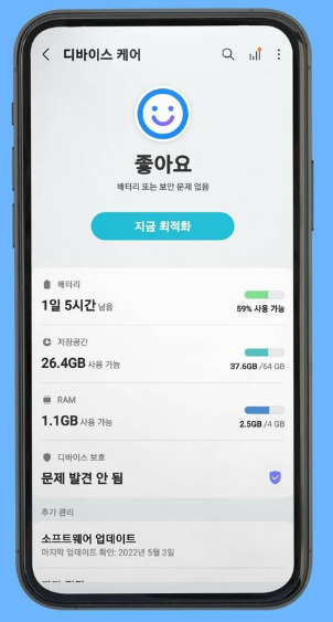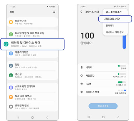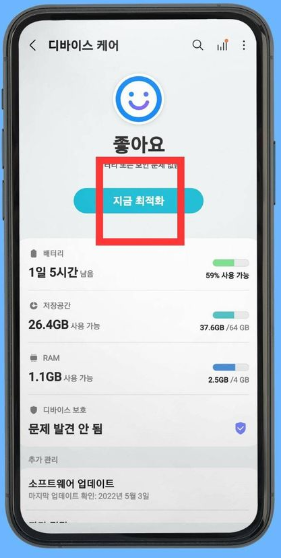 스마트폰 속도 빠르게 하는법 그 두번째는 디바이스 케어를 이용하는것입니다. 스마트폰에서 기본적으로 제공하는 기능인 디바이스케어를 이용하면 스마트폰 속도를 빠르게 할수가 있습니다.