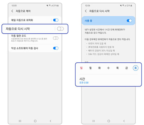 "자동 재시작"을 설정하여 정기적으로 스마트폰을 자동으로 다시 시작할 수 있습니다. 설정 방법은 아래를 참조하세요.