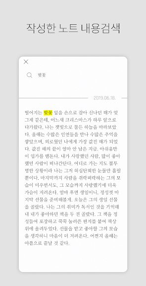 - 지문을 이용한 일기 잠금을 지원합니다. 지문을 통하여 몇 초 안에 일기를 잠금 해제합니다. 일기의 암호를 잊어버릴 염려가 없습니다.