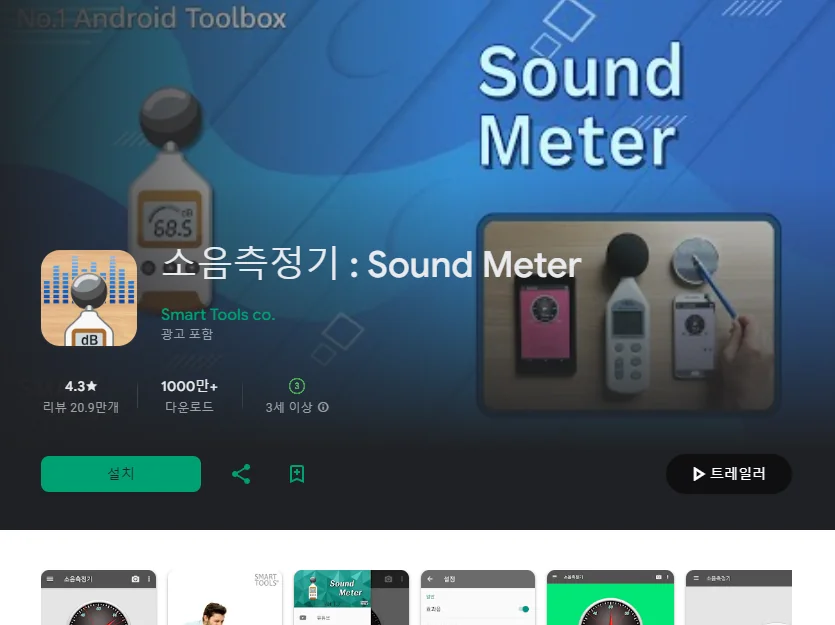 이 어플은 구글플레이스토어에서 "소음 측정기"로 검색했을때 3번째로 나오는 어플입니다. 아래는 소음측정기 : Sound Meter 어플에 대한 자세한 설명이니 참고하세요.
