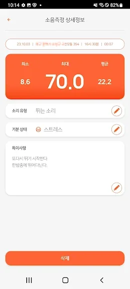 세부사항을 적고 캘린더 모드에서 피해 상황을 통계로 볼 수 있어요. 축적된 자료는 피해 상항을 입증하는 중요한 역할을 해요. 윗층의 무차별적인 발망치와 애들 뛰는 소리를 반드시 기록하세요.