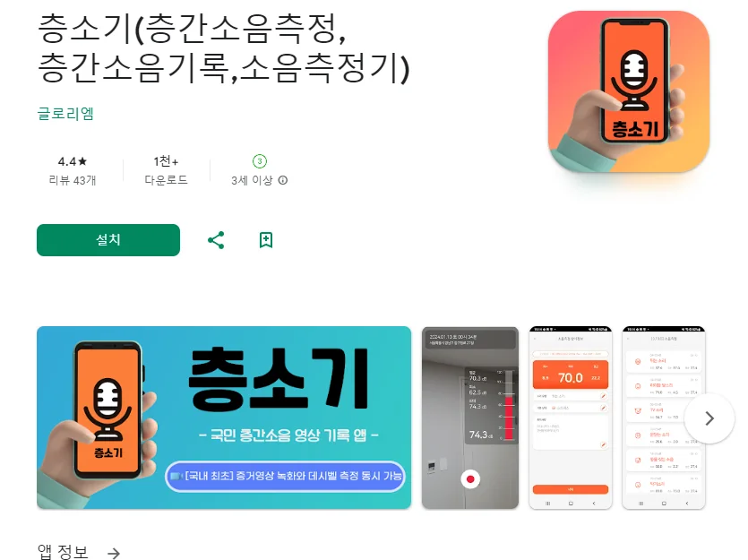 이 어플은 구글플레이스토어에서 "소음 측정기"로 검색했을때 5번째로 나오는 어플입니다. 아래는 층소기(층간소음측정,층간소음기록,소음측정기) 어플에 대한 자세한 설명이니 참고하세요.