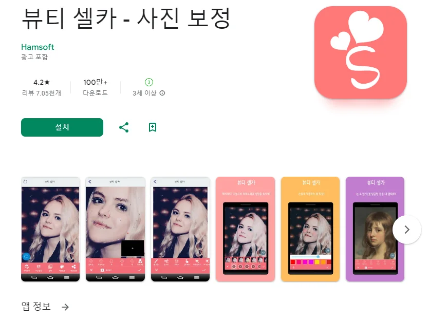 이 어플은 구글플레이스토어에서 "뷰티 셀카"로 검색했을때 1번째로 나오는 어플입니다. 아래는 뷰티 셀카 - 사진 보정 어플에 대한 자세한 설명이니 참고하세요.