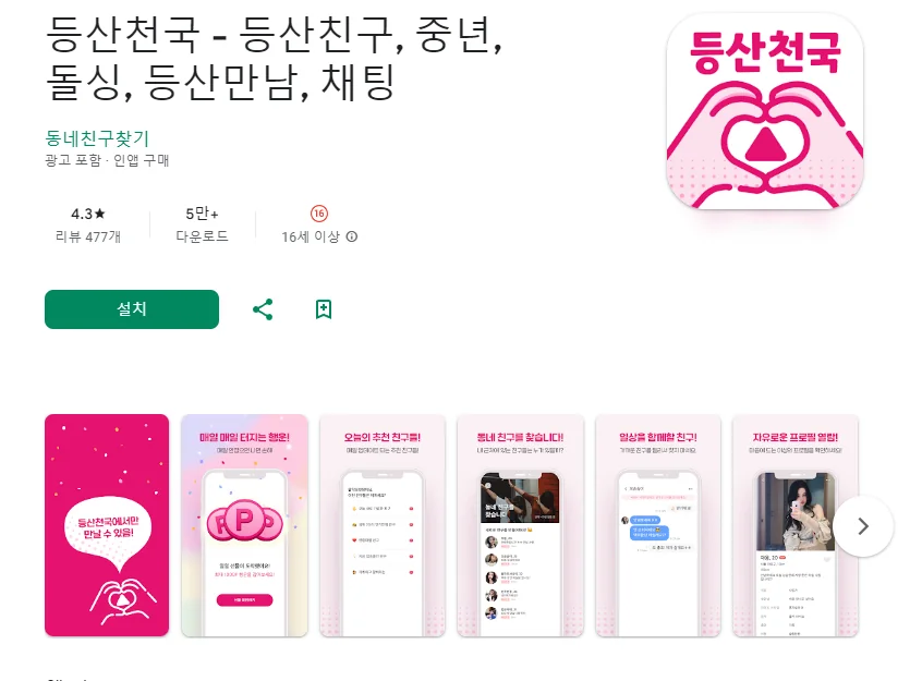 이 어플은 구글플레이스토어에서 "등산 동호회"로 검색했을때 3번째로 나오는 어플입니다. 아래는 등산천국 - 등산친구, 중년, 돌싱, 등산만남, 채팅 어플에 대한 자세한 설명이니 참고하세요.