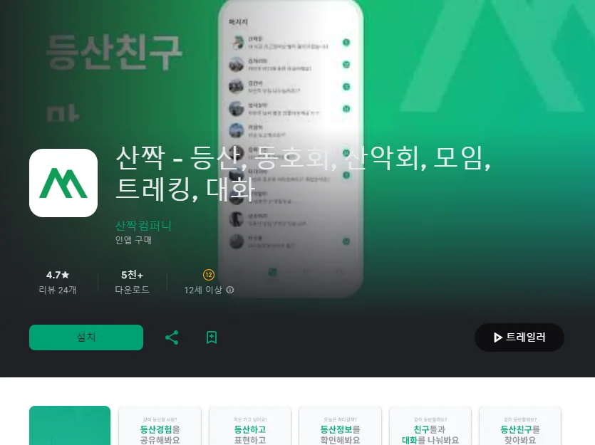 이 어플은 구글플레이스토어에서 "등산 동호회"로 검색했을때 1번째로 나오는 어플입니다. 아래는 산짝 - 등산, 동호회, 산악회, 모임, 트레킹, 대화 어플에 대한 자세한 설명이니 참고하세요.