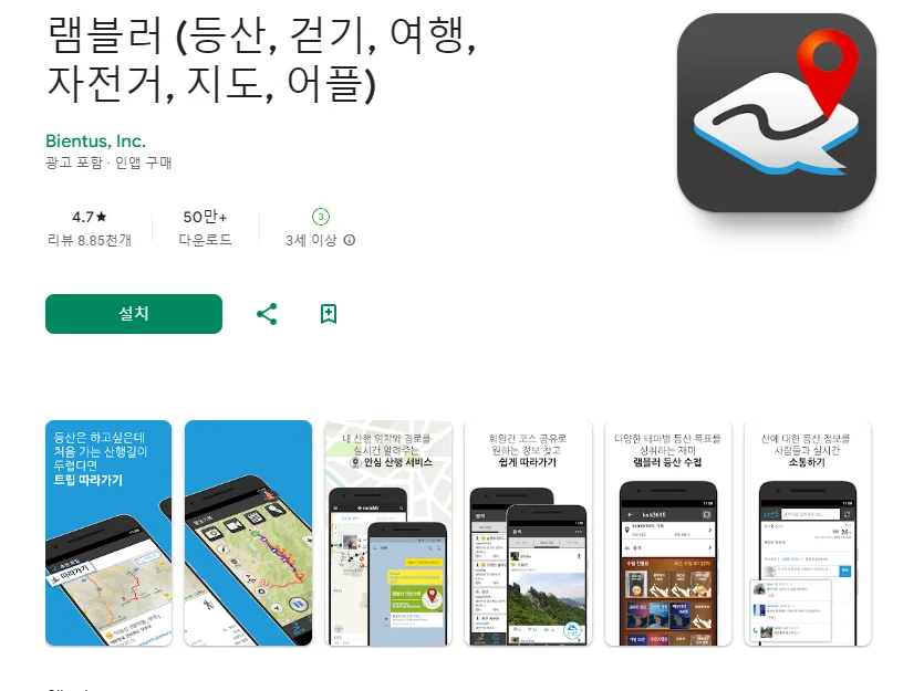 램블러 (등산, 걷기, 여행, 자전거, 지도, 어플) 어플에 대한 스크린샷 정보가 필요하시다면 아래 이미지를 참고하시기 바랍니다.