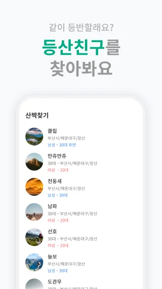 - 나와 비슷한 경험을 공유하고 있는 친구들에게 등산친구를 제안해봐요