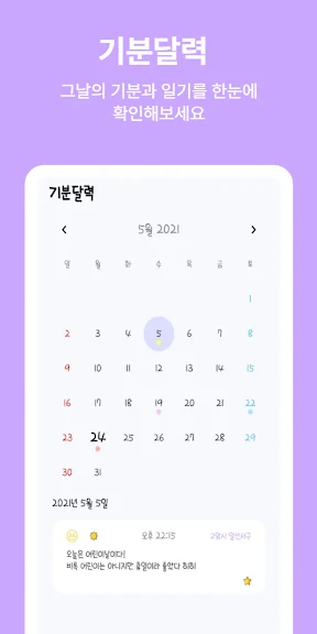 - 리스트형식이 아닌 달력으로 그날의 기분과 일기를 간단히 확인할 수 있습니다.
