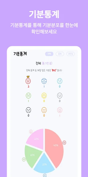 - 깔끔한 파이차트로 작성했던 일기의 기분통계를 확인할 수 있습니다.