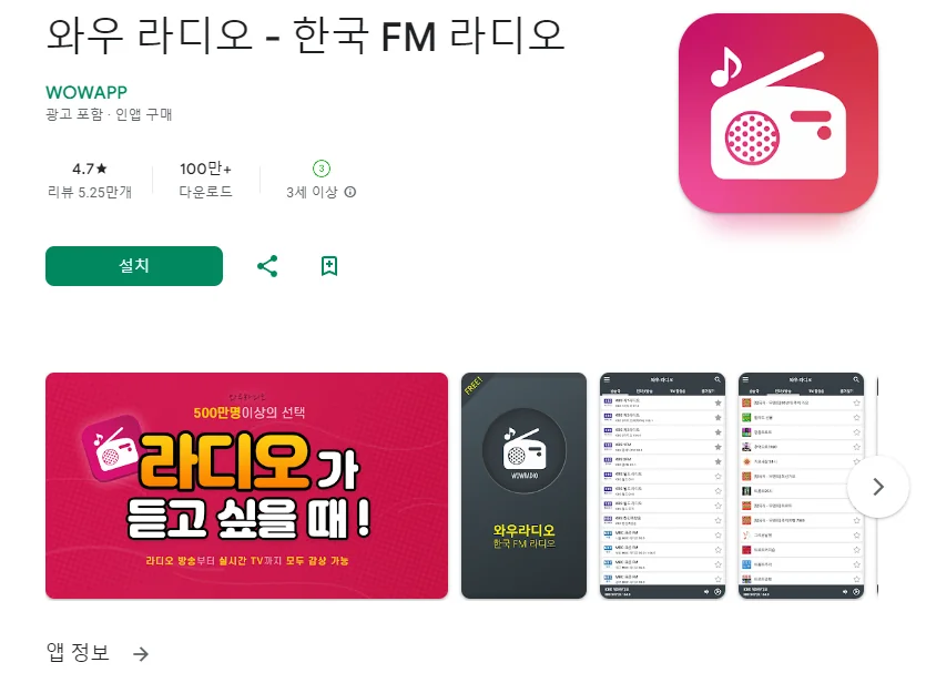 이 어플은 구글플레이스토어에서 "라디오"로 검색했을때 1번째로 나오는 어플입니다. 아래는 와우 라디오 - 한국 FM 라디오 어플에 대한 자세한 설명이니 참고하세요.