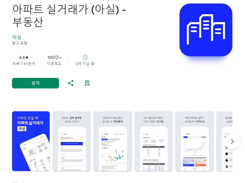 이 어플은 구글플레이스토어에서 "아파트 실거래가 조회"로 검색했을때 2번째로 나오는 어플입니다. 아래는 아파트 실거래가 (아실) - 부동산 어플에 대한 자세한 설명이니 참고하세요.