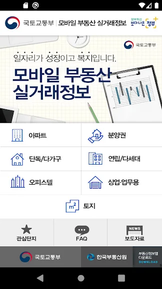 국토교통부에서는 국민들이 원하는 아파트실거래가(매매, 전월세) 정보를 언제 어디서나 보다 신속하고 정확하게 이용할 수 있도록 스마트폰을 이용한 정보제공을 실시합니다.