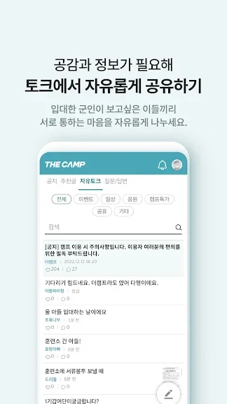 아래는 대국민 국군 소통 서비스 더캠프(THE CAMP) 어플에 대한 스크린샷 정보입니다.