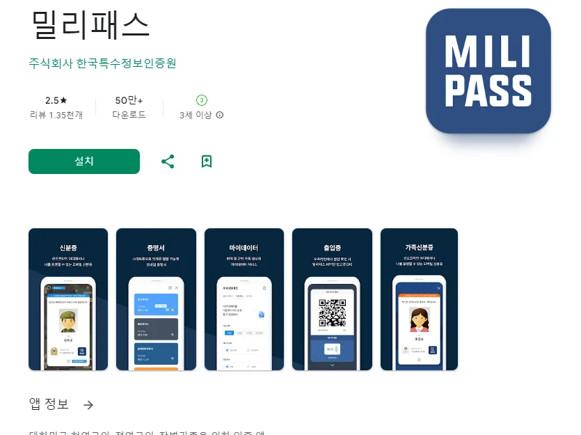 아래는 밀리패스 어플에 대한 스크린샷 정보입니다.