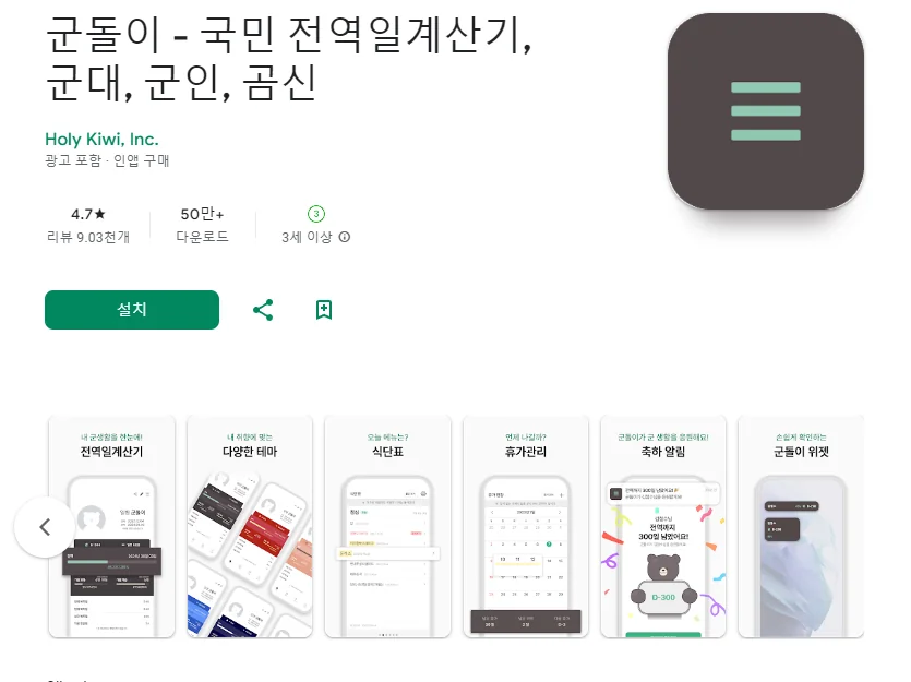 이 어플은 구글플레이스토어에서 "군인"로 검색했을때 1번째로 나오는 어플입니다. 아래는 군돌이 - 국민 전역일계산기, 군대, 군인, 곰신 어플에 대한 자세한 설명이니 참고하세요.