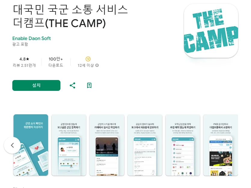이 어플은 구글플레이스토어에서 "군인"로 검색했을때 2번째로 나오는 어플입니다. 아래는 대국민 국군 소통 서비스 더캠프(THE CAMP) 어플에 대한 자세한 설명이니 참고하세요.