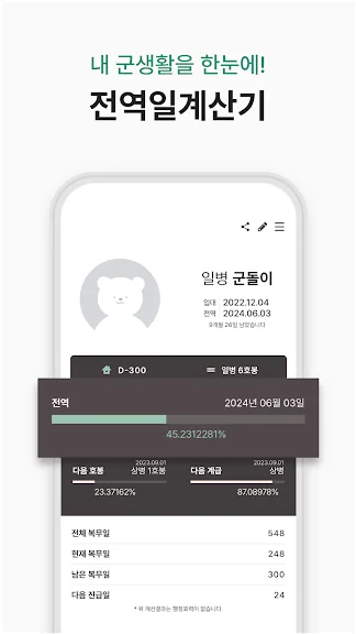 * 남은 전역일, 현재 복무일, 진급일까지 한눈에!