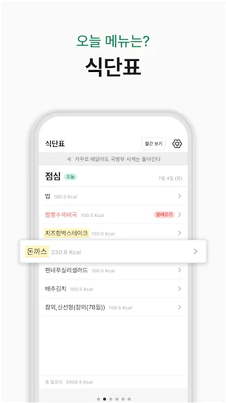 : 오늘, 내일, 다음주 급식 메뉴까지 확인 가능해요! * 메뉴별 칼로리 표시 옵션 제공!