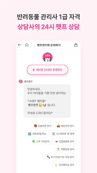 - 펫프렌즈는 반려동물 관리사 1급 자격의 상담사들이 24시간 대기중이에요.