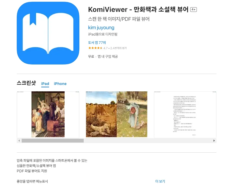 아래는 아이폰 KomiViewer - 만화책과 소설책 뷰어 어플에 대한 자세한 설명입니다. 참고하세요.
