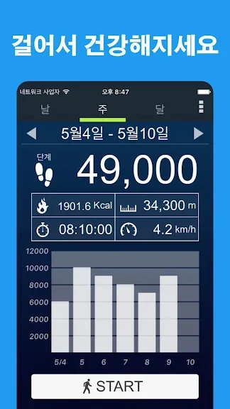 걸음 수 뿐만 아니라 스텝스 만보기 어플은 거리, 걷는 시간 및 속도를 포함한 건강에 대한 중요한 모든 것들을 측정합니다. 워크온 만보기 어플을 사용하면 일일 활동에 대한 모든 피트니스 데이터를 얻을 수 있으며 그래프로 한눈에 볼 수 있습니다!