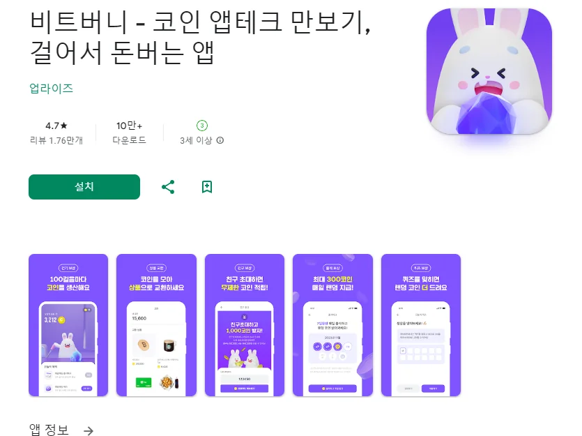 아래는 비트버니 - 코인 앱테크 만보기, 걸어서 돈버는 앱 어플에 대한 스크린샷 정보입니다.