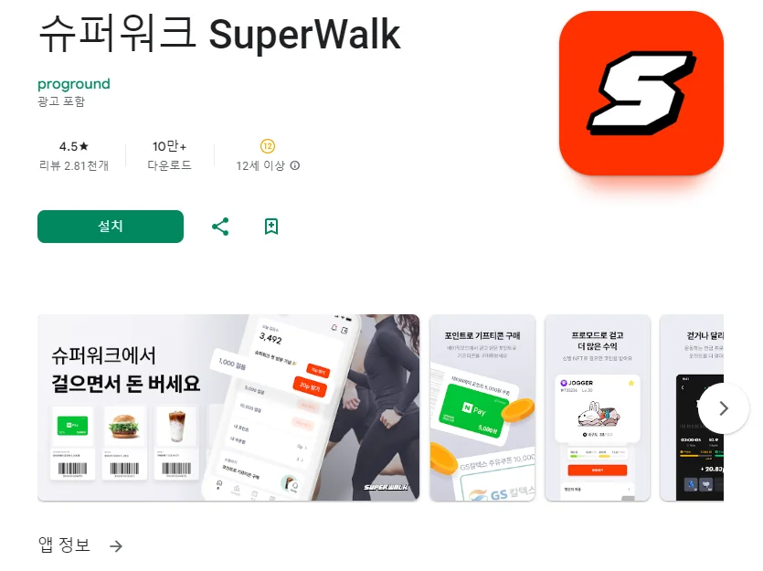 이 어플은 구글플레이스토어에서 "돈버는 만보기"로 검색했을때 5번째로 나오는 어플입니다. 아래는 슈퍼워크 SuperWalk 어플에 대한 자세한 설명이니 참고하세요.